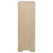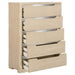 This five-drawer chest offers a balance of style and storage with its light elm finish and brushed nickel fingertip pulls. Rounded corners enhance its sleek design, while extra-large tinted drawers provide ample storage. Built with French dovetail fronts, English dovetail backs, and smooth metal glides, this chest is as durable as it is elegant, making it ideal for compact and modern bedrooms.
