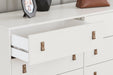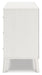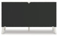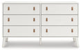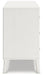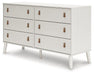 Dare to take minimalism to the max. This dresser has an air of sleek simplicity thanks to its white painted finish with subtle replicated wood grain. The magnificently mod splay legs are a compelling complement to its streamlined design. And with two sets of faux leather drawer pulls that allow you to customize the dresser to suit your space, there's no doubt about it: This contemporary piece is sure to become a classic.