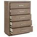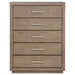 View full detailsChrome finish bar pulls add a touch of shine to the neutral barley brown finish of a modern five-drawer chest. Delivering ample storage with a comp...