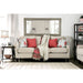 Nadene Ivory Sofa, 80"L X 38"W X 39"H, 145lbs. Enjoy your home and your life with this sofa that satisfies your decorative and comfort needs. The ivory Chenille upholstering looks modern and chic while maintaining an air of understated class. Features like sloped arms and large padded back pillows ensure that once you sit down, you'll look for any reason to stay there. The floral patterns give the ivory backdrop a spring of color and sensational flair that feels fun and celebratory. Features: Sloped Arms Fixed Back Pillows Box Cushion Seat Pillows Included Tapered Legs
